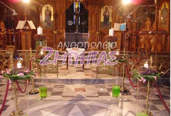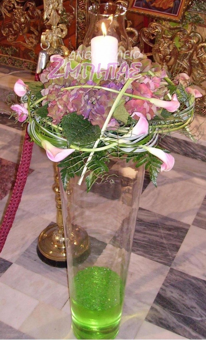 Στολισμός εκκλησίας σε γυάλες με λαχανί ζελέ, ορτανσίες και κάλλες.