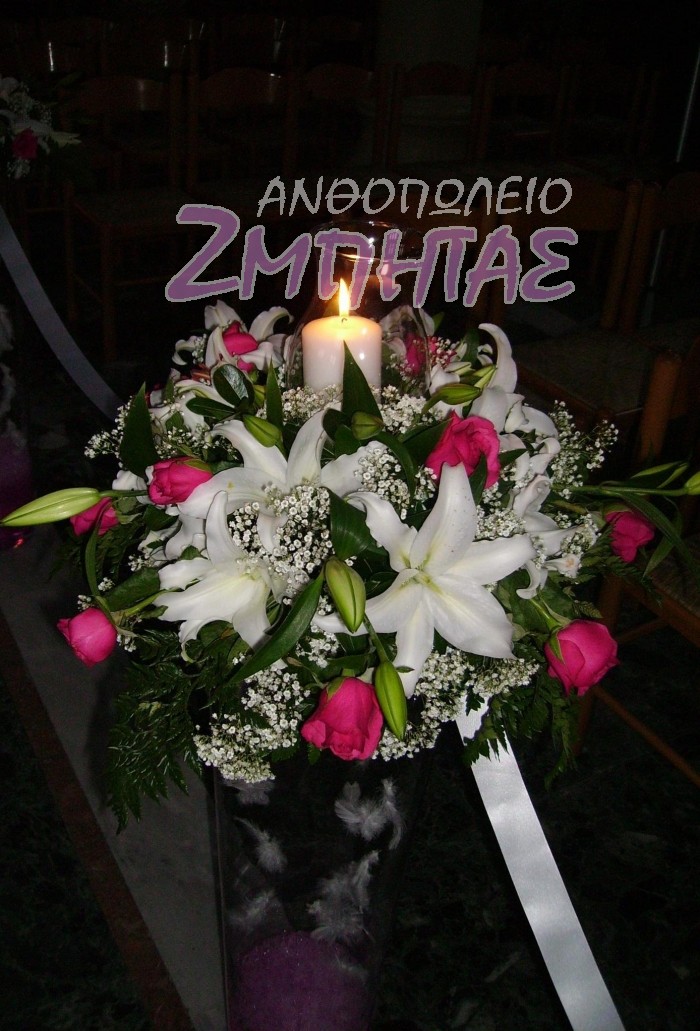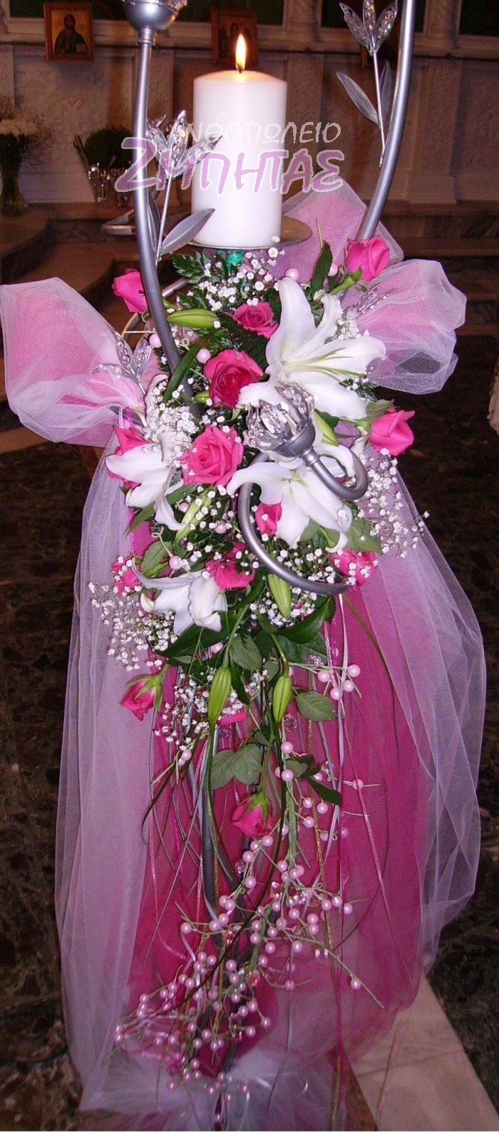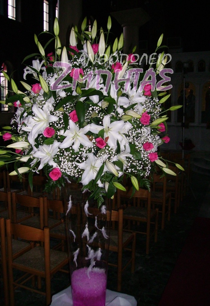 Στολισμός εκκλησίας με άκουα τριαντάφυλλο και λευκά οριεντάλ.