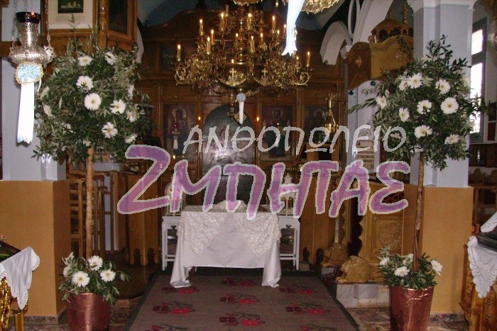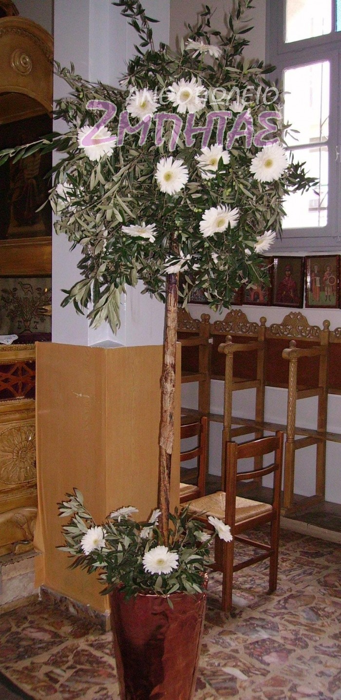 Στολισμός εκκλησίας με ελιά και ζέρμπερα.