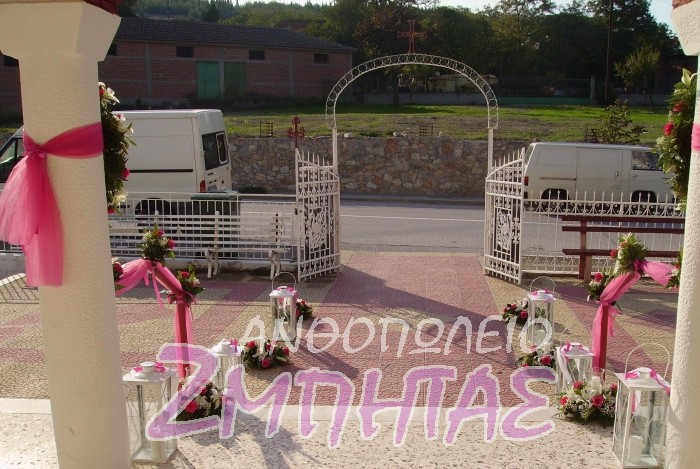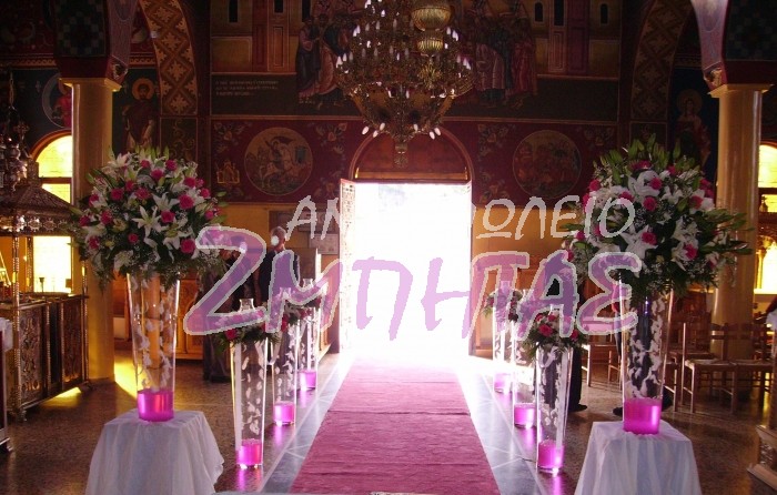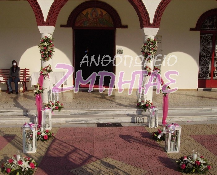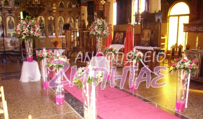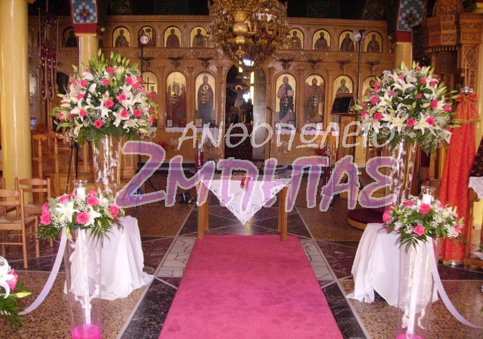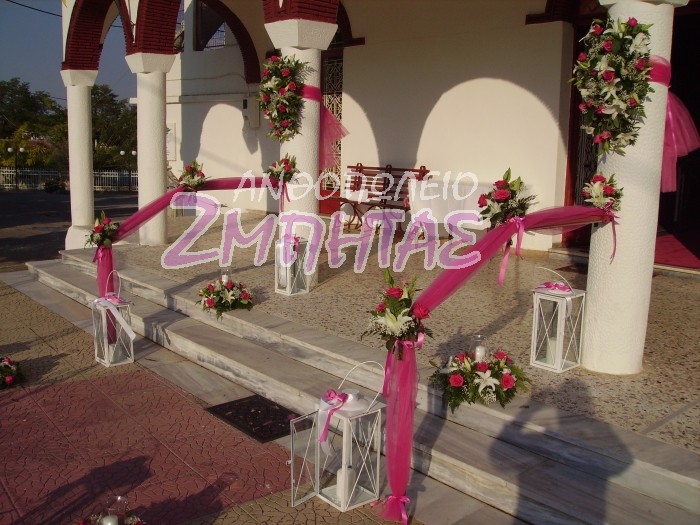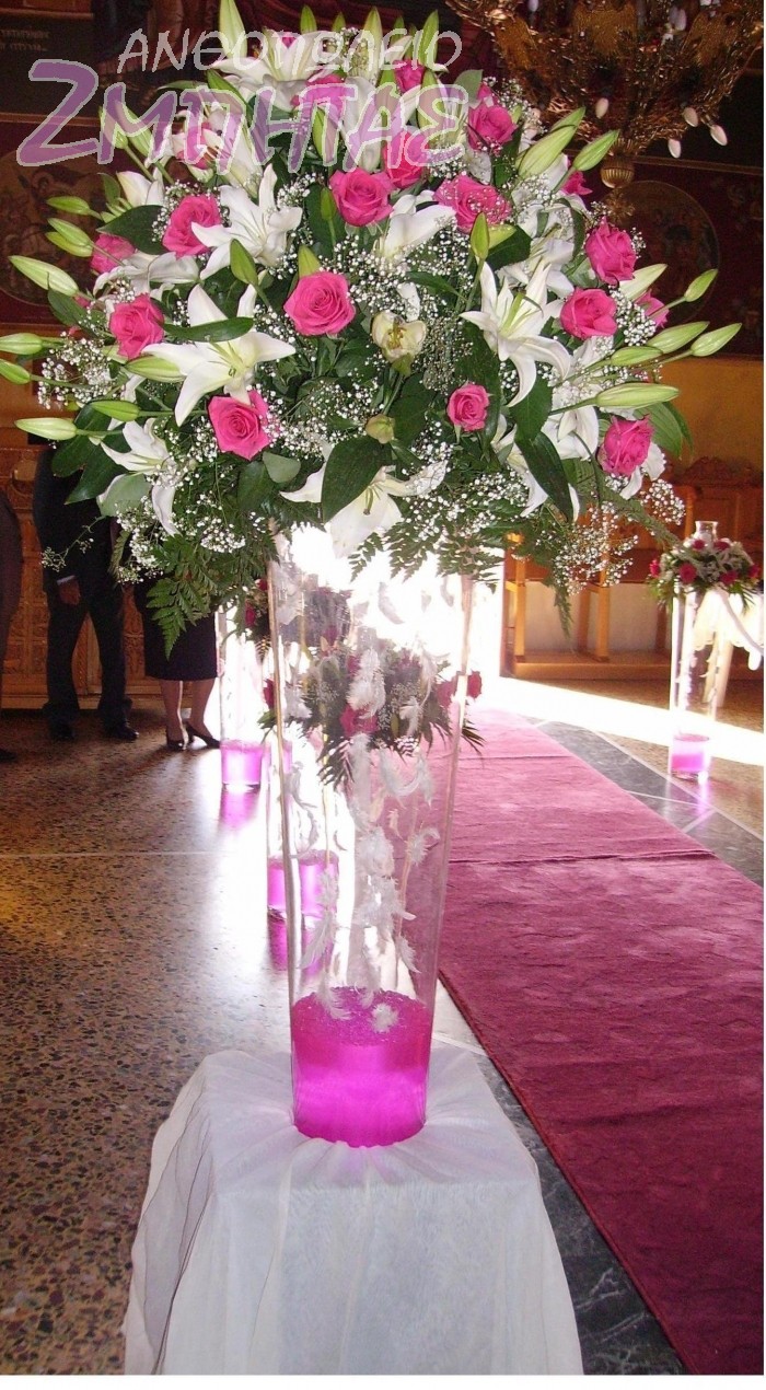 Στολισμός εκκλησίας με φούξια τριαντάφυλλα και λευκά οριεντάλ.