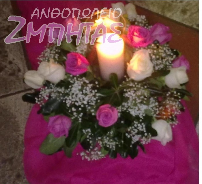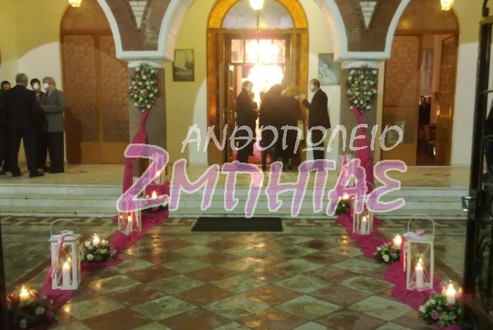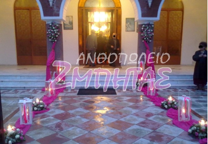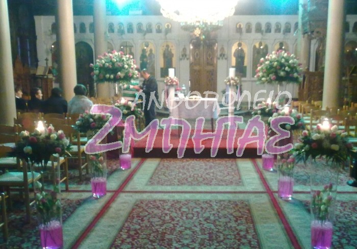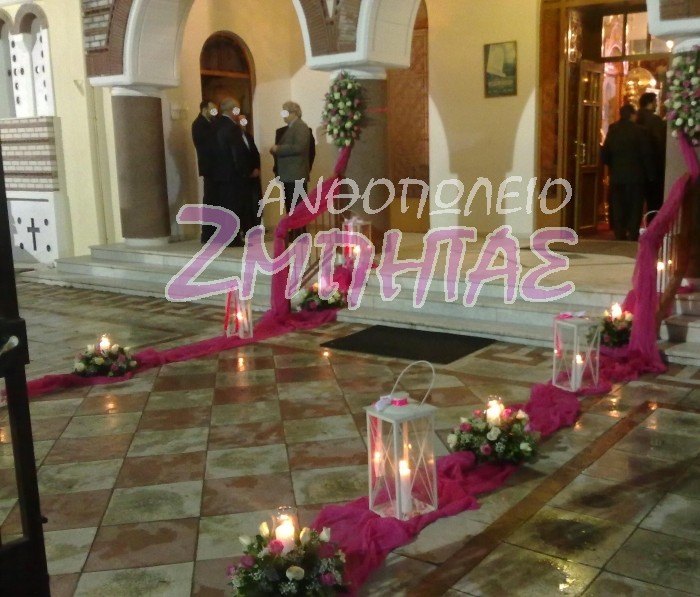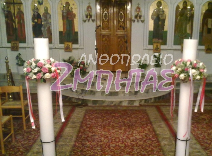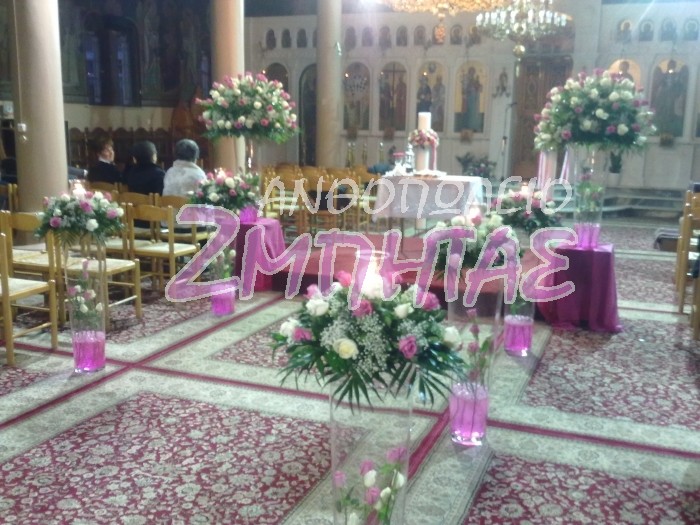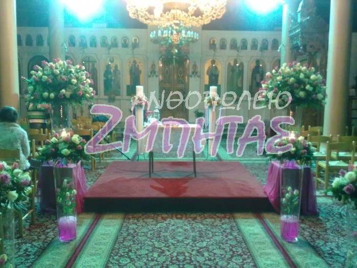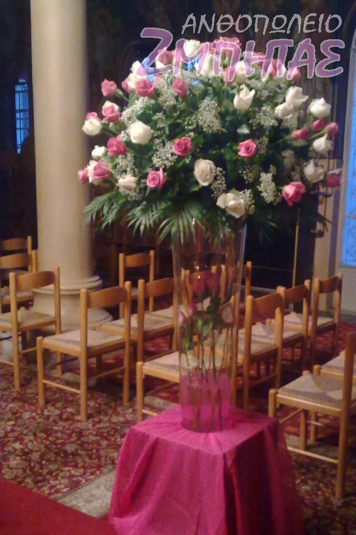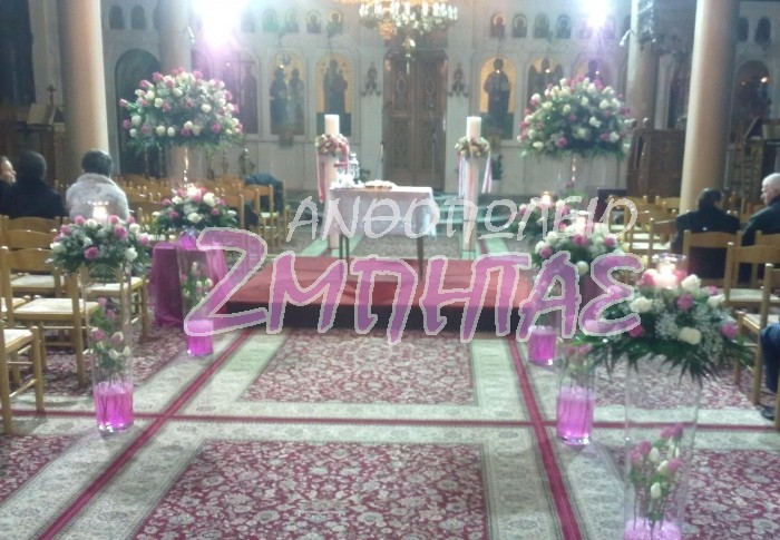Στολισμός εκκλησίας με λευκά και ρόζ τριαντάφυλλα.