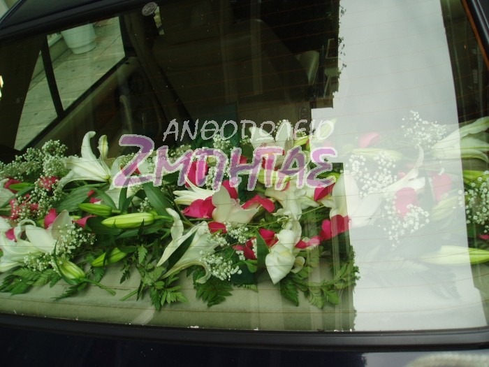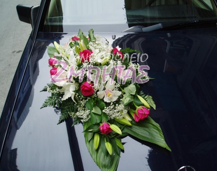 Στολισμός αυτοκινήτου με τριαντάφυλλα, συμπίντιουμ και οριεντάλ.