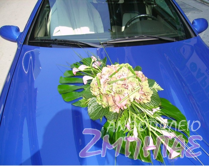 Στολισμός αυτοκινήτου σέ σύνθεση μέ ρόζ ορτανσία , μέ κάλλες ρόζ, διάφορα φυλλώματα και αξεσουάρ.