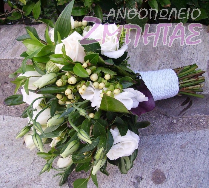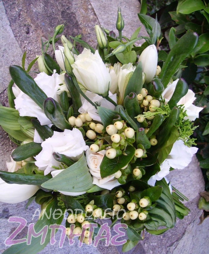 Νυφικό μπουκέτο σέ φυσική κατασκευή μέ λευκά πιπερίκουμ, ιβουάρ τριαντάφυλλα, λευκούς λυσίανθους, τουλίπες καί αστρομέριες.