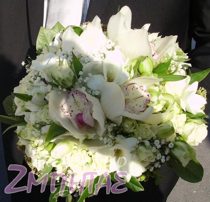 Νυφικό μπουκέτο μέ λευκό μινιόν τριαντάφυλλο, αστρομέρια, φρέζες, συμπίντιουμ και βιβούρνομ.